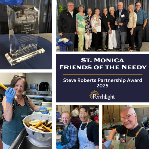 This year, we were honored to present the Steve Roberts Partnership Award to St. Monica Friends of the Needy, whose Tuesday-night dinners have nourished both body and spirit for years. Their dedication reflects the best of what it means to be part of the PorchLight community — showing up, week after week, with generosity and love.
